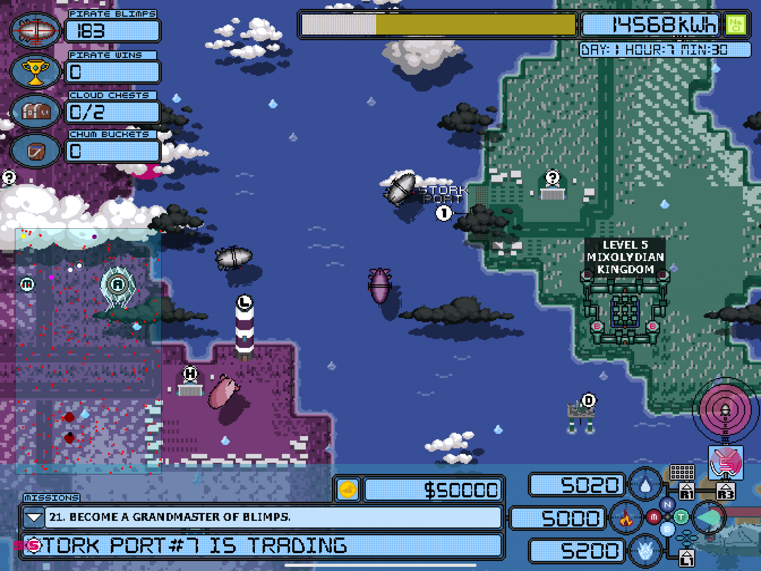 Explore an Open World: Fly around to discover castles, mazes, mini-games, missions, ports, stores, and treasures in Blimps.